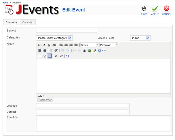 • In the top right hand corner of the “Edit Event”screen, there are three icons: “Save”, “Apply” and “Cancel”.