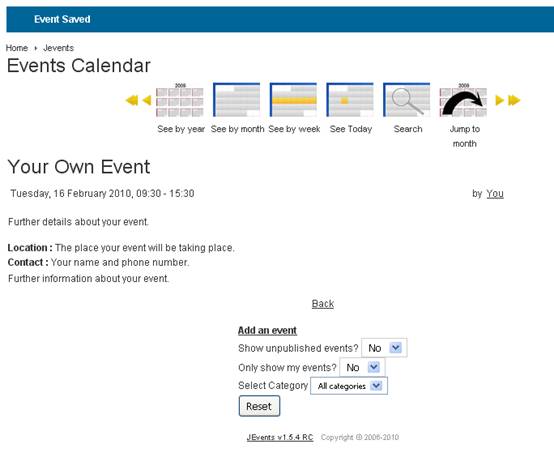 “Event Saved”, and the details of your own event.
