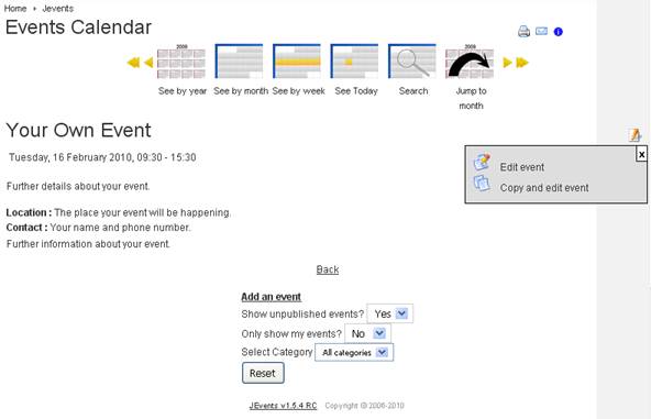 • Go to any “see by ...” mode of the “Events Calendar”, with the bottom menu options set appropriately, and click on the name of your event.